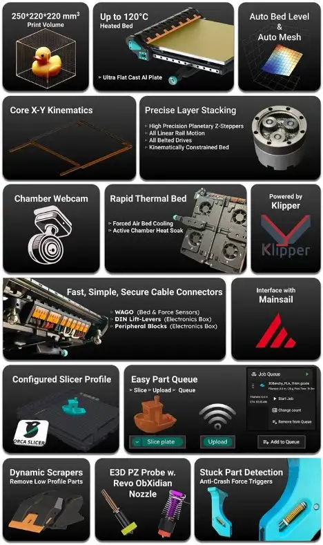 Vertigo MK1, 3D baskı dünyasında en büyük sorunu — insan müdahalesini — ortadan kaldıran devrimci bir çözüm. Otomatik ejeksiyon sistemi, yüksek hızlı CoreXY mekanizması, mühendislik sınıfı termal yönetim ve Klipper açık kaynak altyapısı ile bu yazıcı sadece bir araç değil, tam bir üretim çözümüdür.