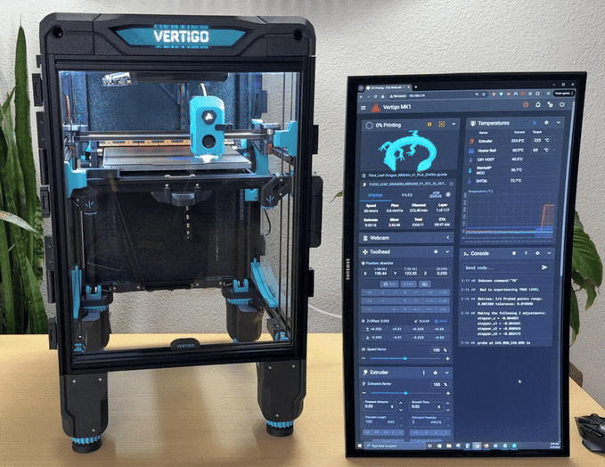 Klipper firmware üzerinde çalışan Vertigo MK1, Mainsail veya Fluidd arayüzü aracılığıyla herhangi bir cihazdan web üzerinden erişim imkânı sunar. Deneyimli kullanıcılar için derin özelleştirme ve kontrol seçenekleri mevcuttur.