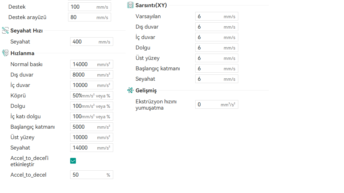 Kullandığım destek ayarlarından şu an memnunum. Zaman zaman filamente göre biraz değişiklikller oluyor ama bu ayarlar şu an iyi.