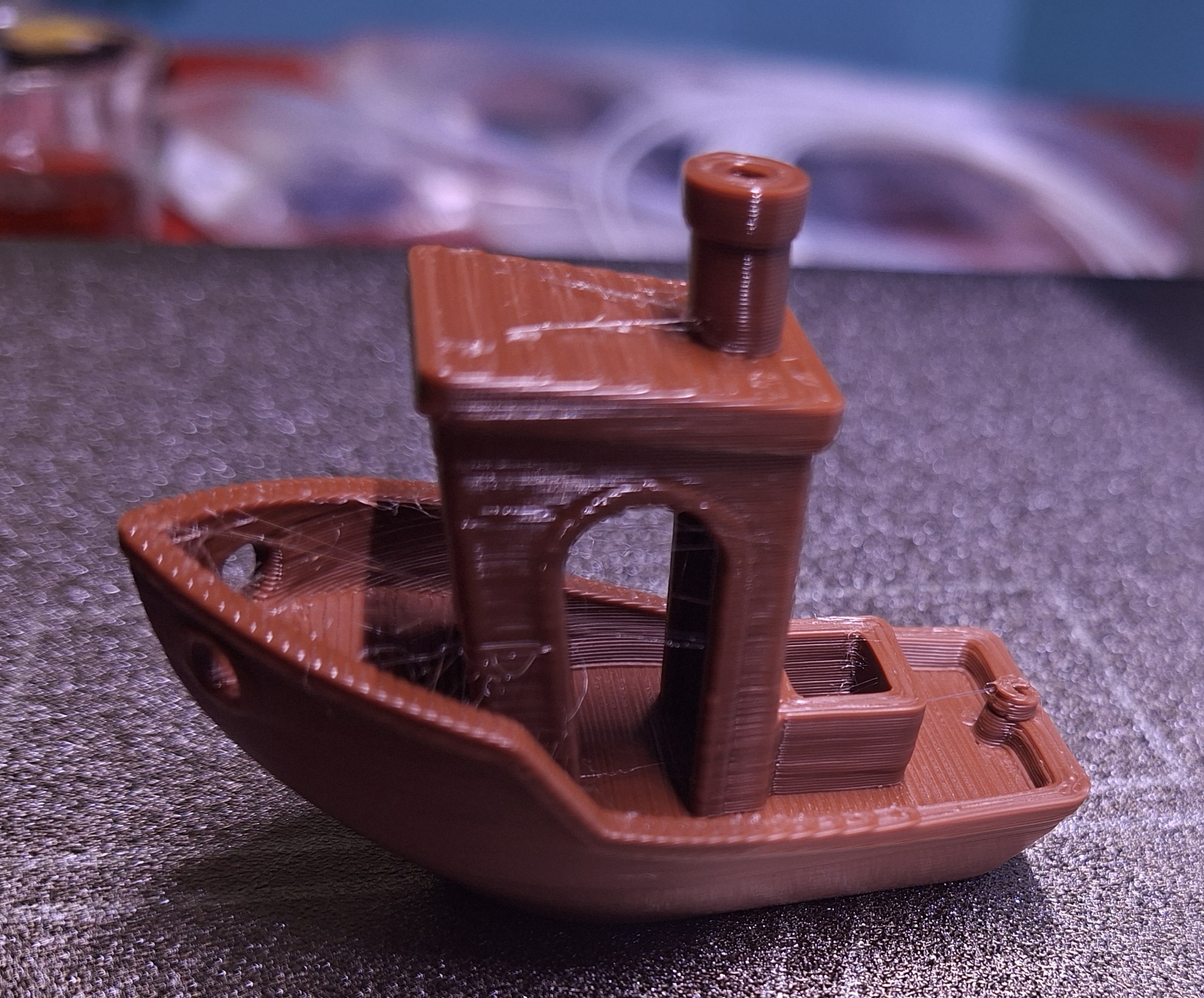 Test baskısı olarak benchy dedikleri test gemisinden bastım Aşağıda fotoğrafı var. 15-20 dakikada sorunsuz bastı. Ama ben makara üzerinde yazan tabla ve flament sıcaklığına bakıp ayar yapmayı unuttum. Neye göre bastı, nasıl yaptı bir fikrim yok. 220 derece flament, 65 derece tabla sıcaklığı vardı. Yapay zekaya sordum ben bu modeli bitince hemen sökeyim mi soğusun öyle mi sökeyim diye. tabla sıcaklığı 30-35 derecelere kadar soğusun daha kolay ayrılır dedi. Öyle de oldu gerçekten. Tablayı takarken ya da modeli sökerken tablanın ortasına elimi değdirmeye dikkat ettim. elimizdeki yağ asiti diyeyim artık her neyse modelin tutmamasına sebep olabiliyormuş.
