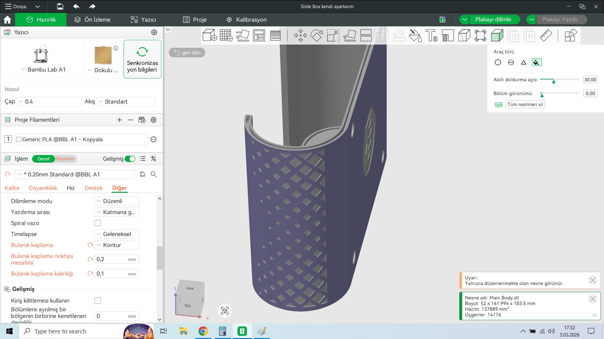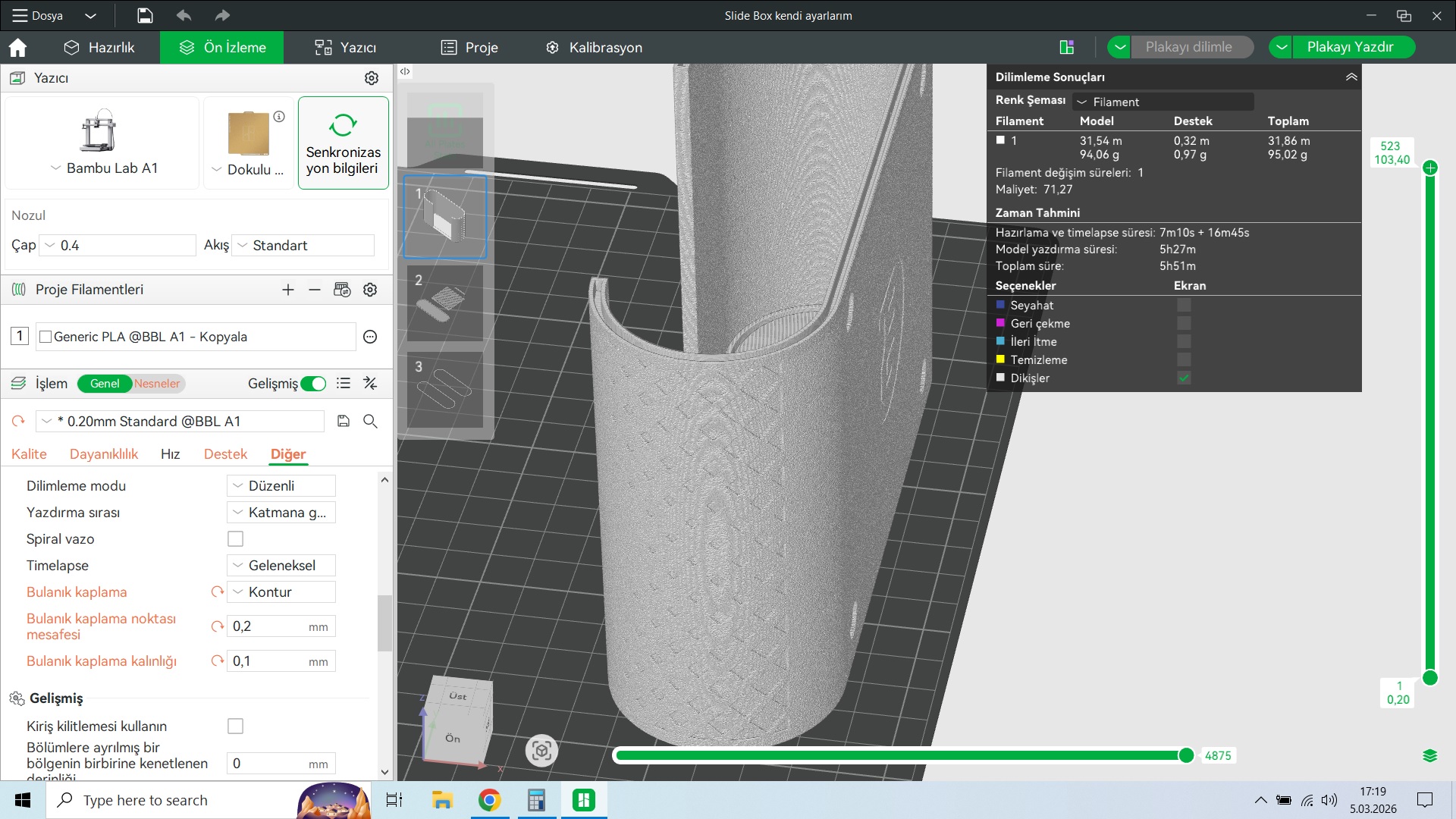 Katman çizgili görüntü elbette hoşuma gitmediği için ben de bulanık kaplama olayını denemek istedim. Genel olarak sonuçtan memnun kaldım fakat süreyi 2 saat daha uzatıp 5.30 saate çıkardı. Benim modelde rahat 2 saat attı yani. Değer mi derseniz değerdi çünkü benim için önemli birine gidecekti. Dış duvar, iç duvar hızını bile azalttım bir tık ama bu başka bir konu.